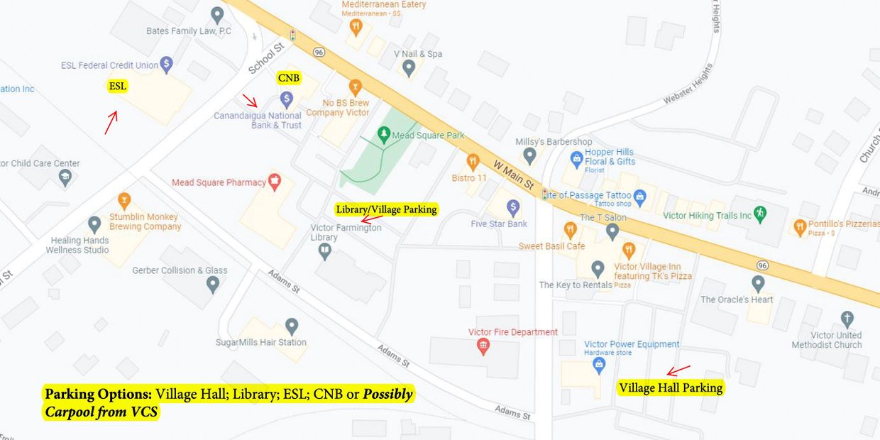 PARKING: Available at the Village Hall, Library, ESL, CNB, at VCS (via carpool)